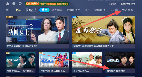 1、下载软件启动进入首页,按照页面推荐栏目,选择自己喜欢的港剧类型播放,这里我们点击免费专区。