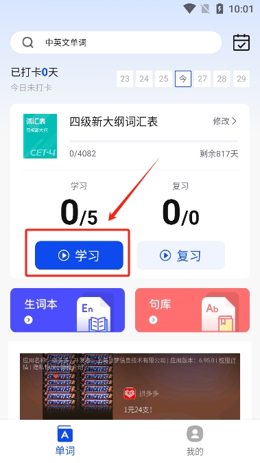4.点击学习就可以开始背单词了。