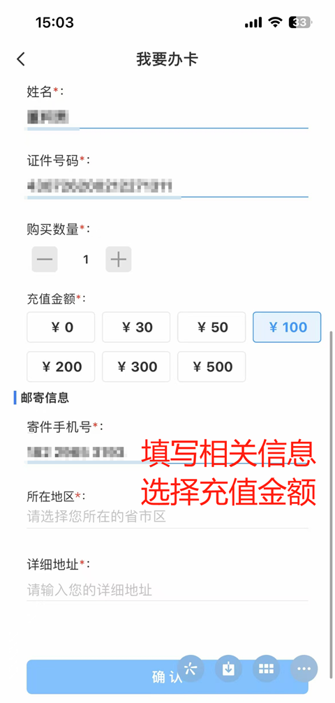 4、上传身份证照片,填好邮寄信息、充值金额,点击确认支付,可查询办理进程。