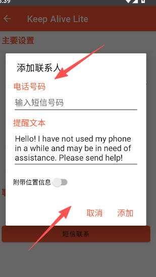 4、预警部分的联系人以及文本内容,由你来亲自设置完成,记住要添加哦。