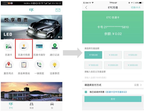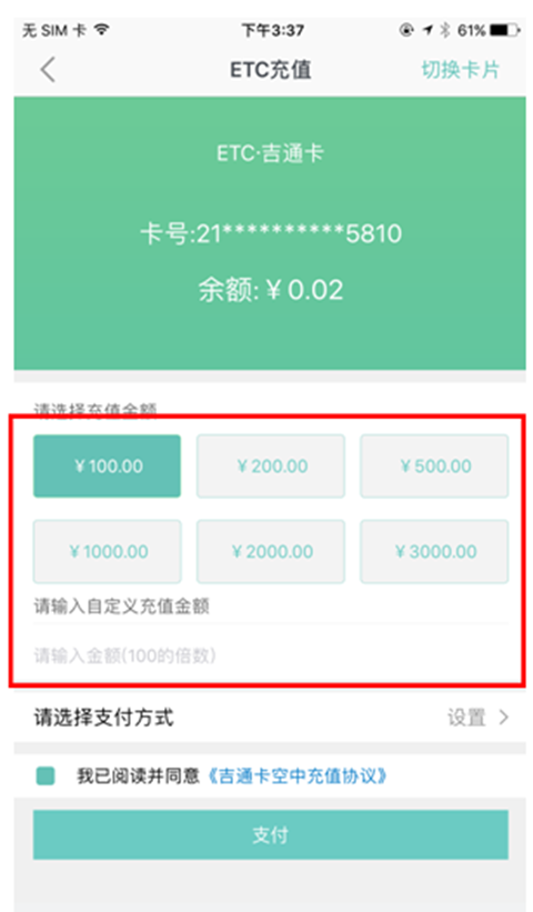 3、用户点击吉通卡充值,进入ETC充值页面,选择充值金额,或手动输入自定义充值金额(手动输入的自定义充值金额需为100的倍数),然后进行付款。