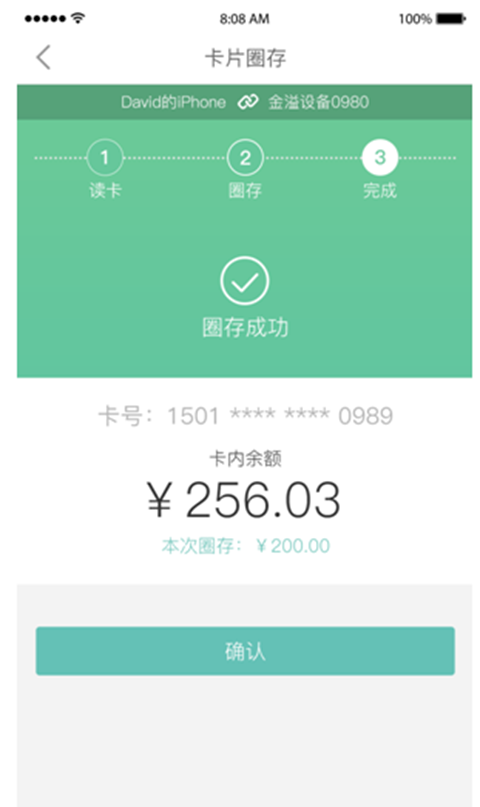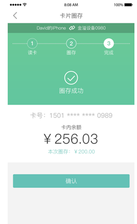 圈存完成后,跳转到圈存成功页面,此时即完成卡片圈存操作,点击【确认】,跳转到首页。