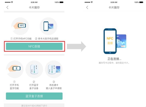 打开手机NFC功能,点击【吉通卡圈存】,进入选择连接方式页面;