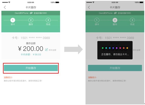 在NFC感应页面,把吉通储值卡紧贴手机NFC感应区域,感应成功则跳转到读卡页面;