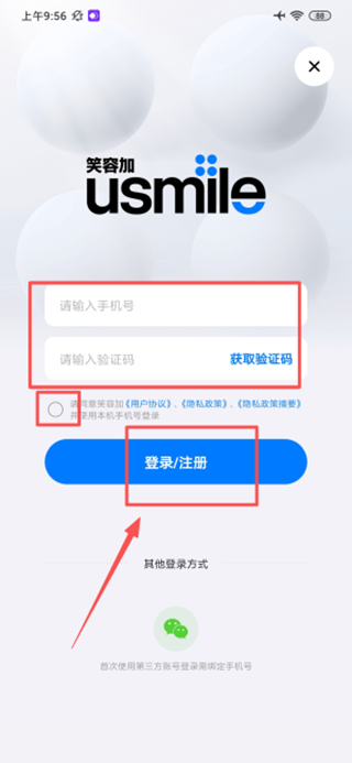 2、输入手机号与验证码并勾选协议,完成登录注册。