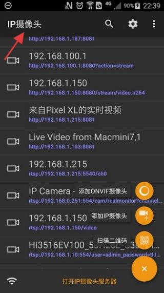 2、点击IP摄像头地址列表页面,显示多个IP地址及对应视频源,还有添加摄像头等功能选项,方便管理不同视频源。