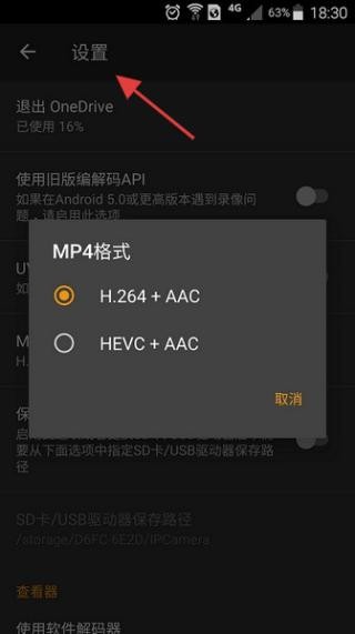 3、点击设置页面,有退出OneDrive提示,聚焦MP4格式选择,可在H.264+AAC与HEVC+AAC间切换,满足不同存储需求。