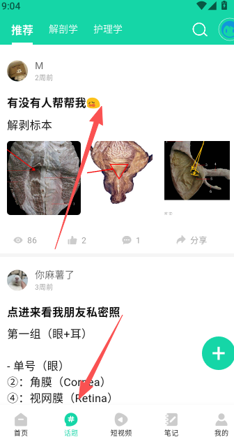 2、话题,以解剖学和护理学两个大类目为主进行话题讨论,你可以将它理解为一个社区类的论坛软件,求助发帖或是了解更多医学类知识,在这里都可以得到很好的帮助和满足。