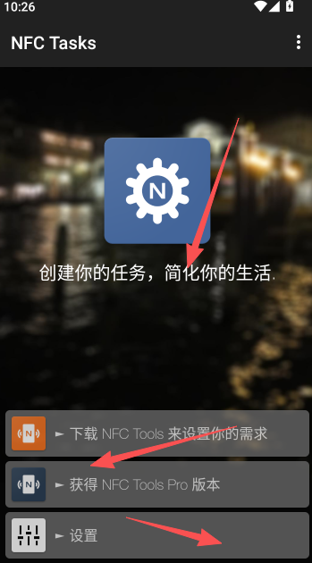 1、NFC Tasks是配套NFC Tool和NFC Tools的门禁卡应用,使用前根据下方提示选择下载应用进行适配,完成以后进入设置界面。