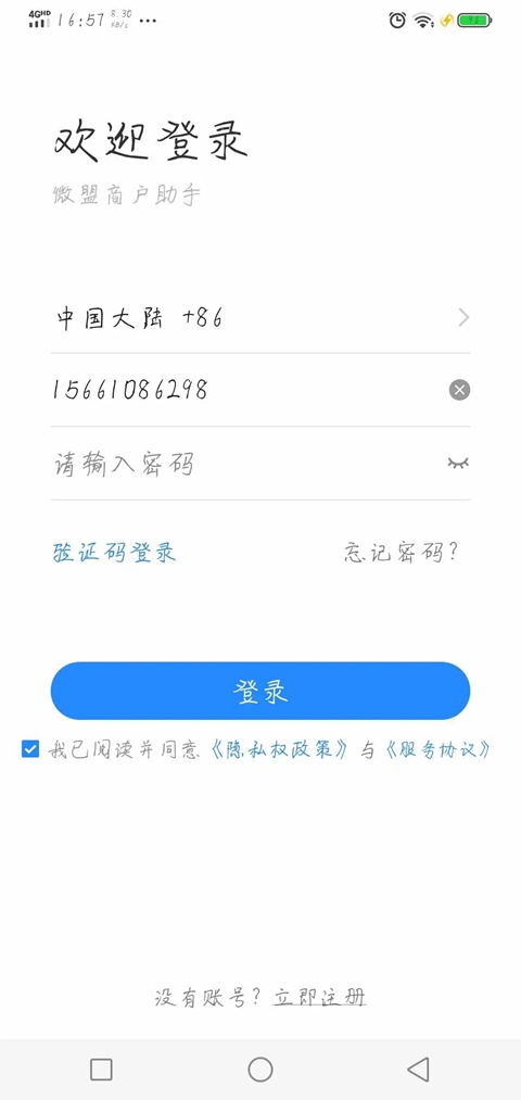 1、打开App,进入登录页面。输入手机号,密码进行登录(团长的联系方式“手机号”,同时作为微盟商户助手登录账号,创建后不可修改。)