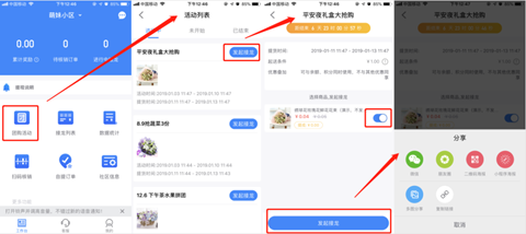 1、团长点击【团购活动】,进入活动列表,选择活动后进入活动详情页,选择合适商品发起接龙,支持微信、朋友圈、二维码海报、、多图分享等多种分享方式。