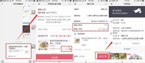 买家点击团长分享的接龙链接后进入活动页面,选择商品及数量,点击【去结算】进入订单结算页,填写提货人姓名及手机号后提交订单完成付款。