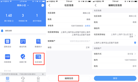 团长可在社区信息中更改手机号、社区名称、收货地址以及收款账户等信息。(收款账户填常用的,避免打款失败)