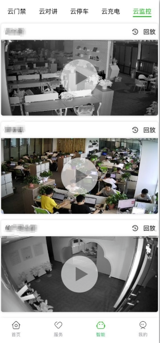 业主们可以打开点生活APP智能硬件——云监控模块,随时查看小区各公共区域的实时监控,或者灵活调取各时段监控回放