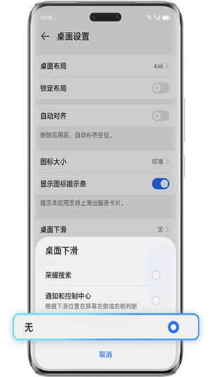 同样进入设置>桌面和个性化>桌面设置页面,点击桌面下滑选择无或通知和控制中心后,再次下拉桌面将不会进入搜索页面。