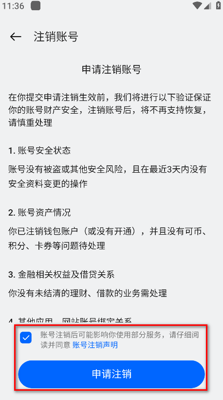 7.勾选账号注销后可能影响你使用部分服务,请仔细阅读并同意 账号注销声明,点击申请注销。