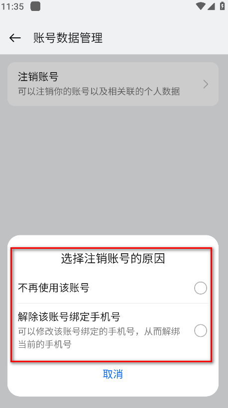 6.选择并勾选注销账号的原因。