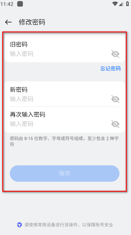 5.输入旧密码、新密码、再次输入新密码,然后点击保存即可。
