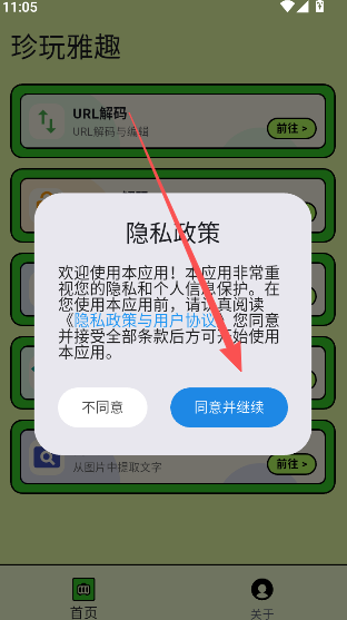 1、查阅软件隐私政策服务部分,点击同意并继续进入。