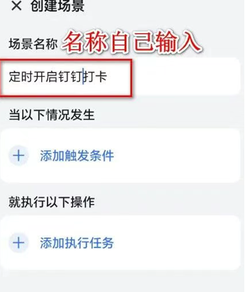 II、创建这个智慧场景的具体过程首先在“场景名称”下面的输入框输入文字,命名要创建的智慧场景名称为“定时开启钉钉”: