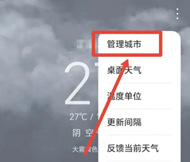 2、在展开的列表中选择管理城市,进入添加和删除的选项。
