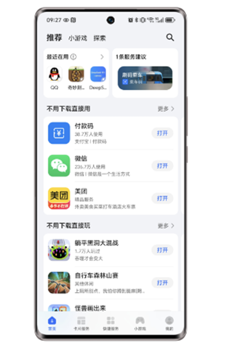 在推荐页面,我们将根据热点及使用频率进行服务推荐,涵盖卡片、小游戏、快捷服务、AI应用等;也会定期推出专题活动、抽奖活动等,敬请关注。