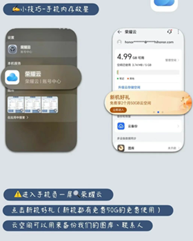 点开手机负一屏,搜索荣耀云并点击进入→点击新机好礼(初次使用)→点击领取50GB云空间,云空间可以用来备份我们的图库、联系人、备忘录以及日历等!