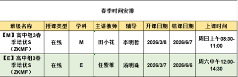 在线班次100人满班,一个主讲老师一个辅导老师,寒假10次课程,春季是主要开设数学(M),物理(P),英语在线班次(E)。课程总纲是:寒假开始一轮复习课,春季开始二轮复习课程。