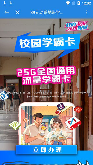 专属优惠智能推送:根据您的使用习惯,精准推荐高性价比套餐(如校园学霸卡25G全国通用)。