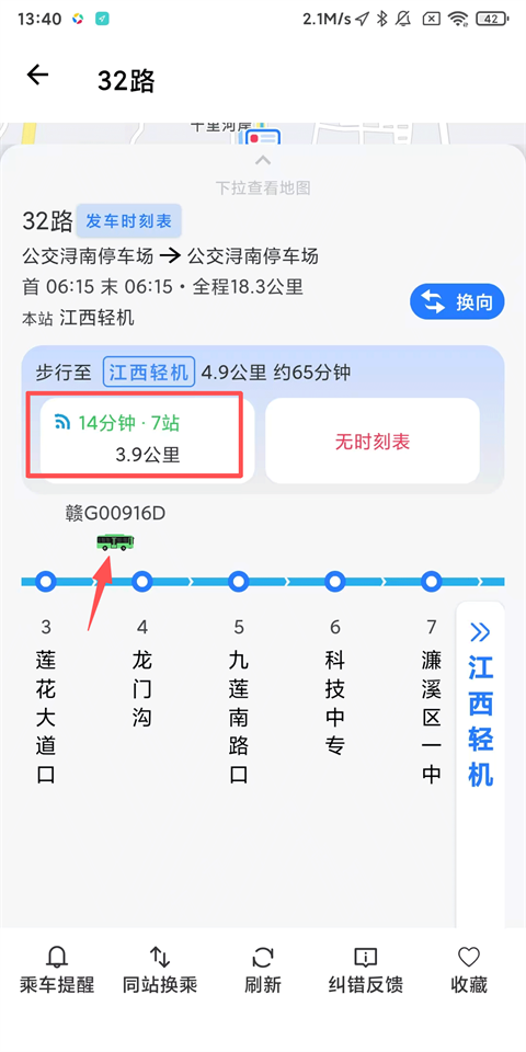 3、即可查看此路公交车的实时位置和距你所在站的距离。