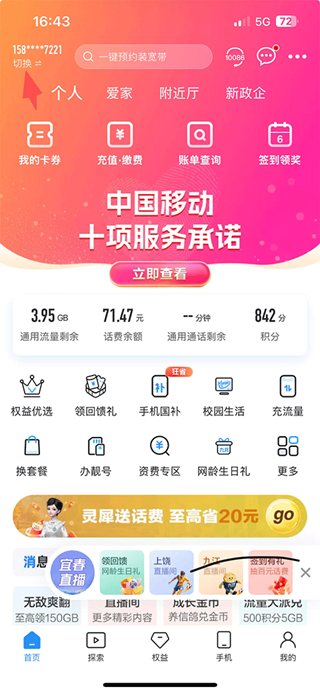 1、打开中国移动河南APP,点击首页左上角的【切换】按钮;