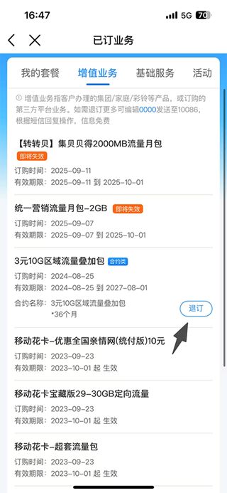 3、在增值业务中点击右侧的【退订】来取消套餐;