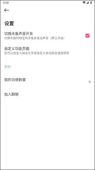 4、还可以在设置中切换敲击木鱼的声音、敲击木鱼后的文字显示,
