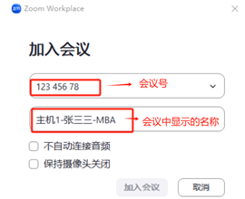 1、下载成功后,安装、打开Zoom软件,点击加入会议、录入“会议号”和“在会议中显示的名字”。