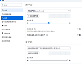 (1)请检查自己是否选择了正确的播放设,且音量调节到合适的大小(您可以点击ZOOM会议管理菜单栏 “ 连接语音 ”后的 “ 向上箭头 ”, 选择 “ 音频设置 ” 进行测试调适和测试 ,如图所示: