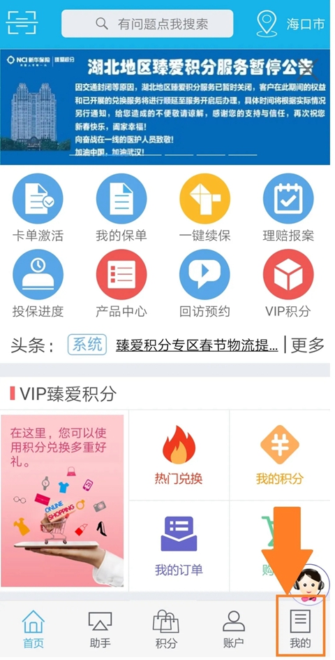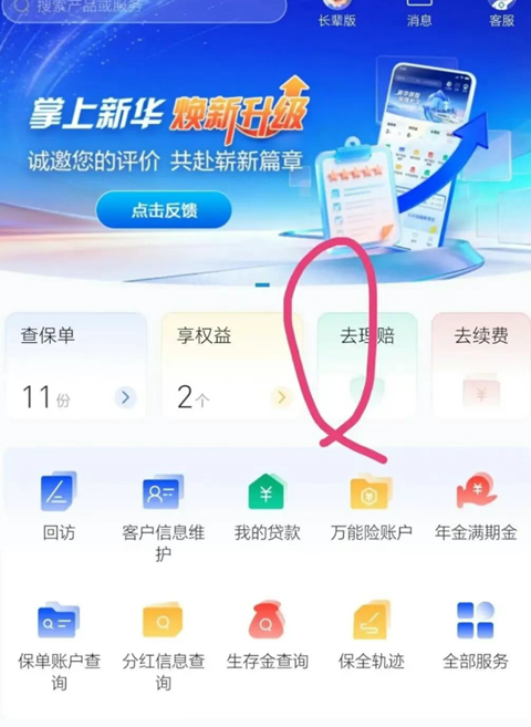 1、登录掌上新华进入首页点:去理赔。