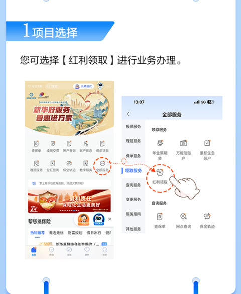 为把这份责任转化为更便捷的服务举措,公司不断升级服务体验,全新推出掌上新华"红利领取"服务。保单红利分配后,投保人只需三步操作,即可轻松在线完成领取。