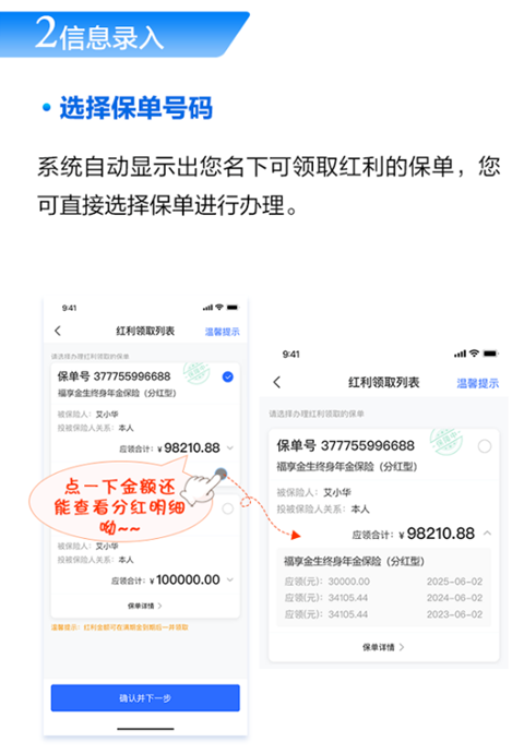 同时,业务办理过程中还能随时查看应领金额和分红明细,让每一笔权益都清晰可见,畅享高效服务新体验。