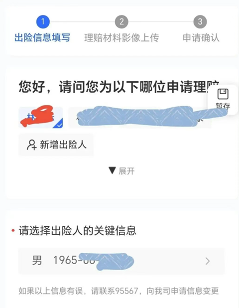 2、出险填写:点击办理理赔的人员名字,为被保险人本人。
