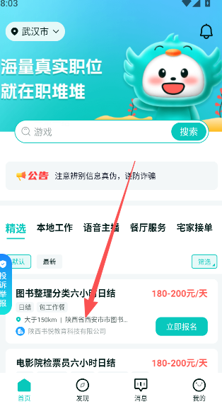 2、在首页工作栏目中,找到自己所想要从事的岗位兼职,点击立即报名。