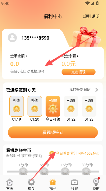 1、金象视界签到可点击用户界面的福利版块,选择图示的看视频签到。