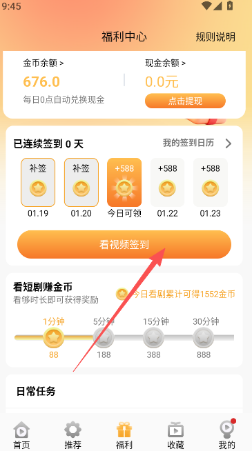 3、日常任务:看广告领现金,完整看完全部广告,可获得一定收益。
