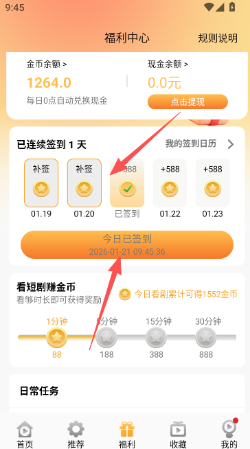 2、签到赚钱:每日上线签到获取金币,金币可以转换为实际的现金奖励收益。