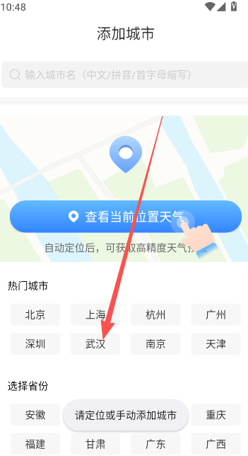 1、手动定位或是通过城市名和搜索的方式,添加当前所在的城市位置信息。
