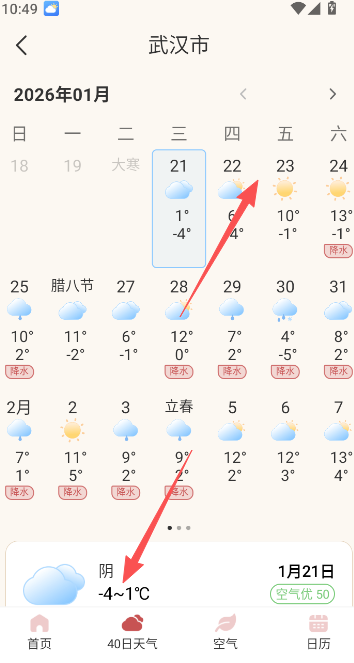 3、点击40日天气,可以查看当前和未来40天的变化情况,详细数据包含了天气的变化以及二十四节气的变化部分。
