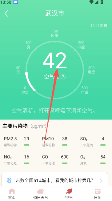 4、在空气版块中,还可以查看最新城市的污染指数,如果觉得当前天气情况较差有明显的不适应,在这里点击各项指数了解更多就行。