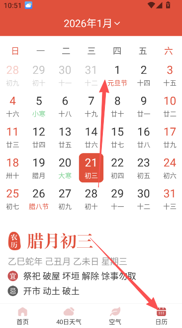 5、日历功能,了解天气变化动态的同时,也可以查看阳历有阴历,方便自身出行计划的办事。