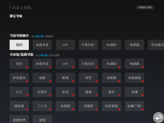 多种内容板块可供用户选择,4K臻彩专区给予用户最佳的观影体验感,用户还可以通过【自定义导航】,设置专属的新视听板块。