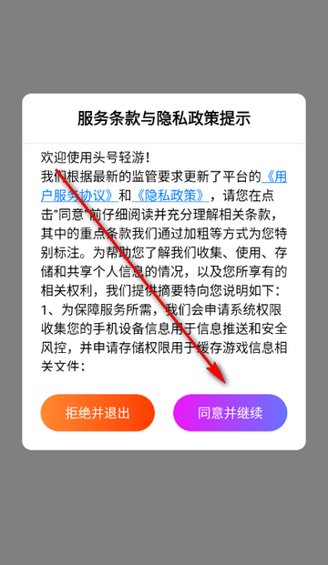 1、打开头号轻游app,点击同意隐私政策