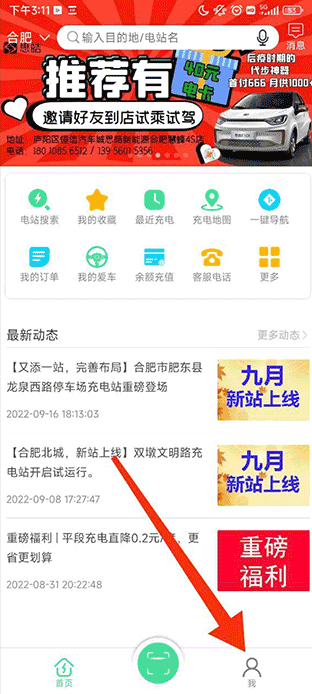 1、下载安装好合肥充电app,软件首页后,点击我。